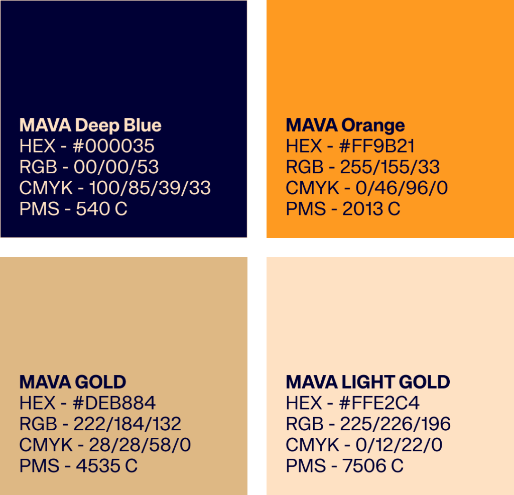 Hiernaast staan de vier hoofdkleuren die we gebruiken om MAVA stijl tot leven te brengen. De samenstelling zorgt voor een elegante uitstraling met een speels randje. Hou het contrast hoog in kleurgebruik en gebruik bijvoorbeeld niet het oranje op het goud.