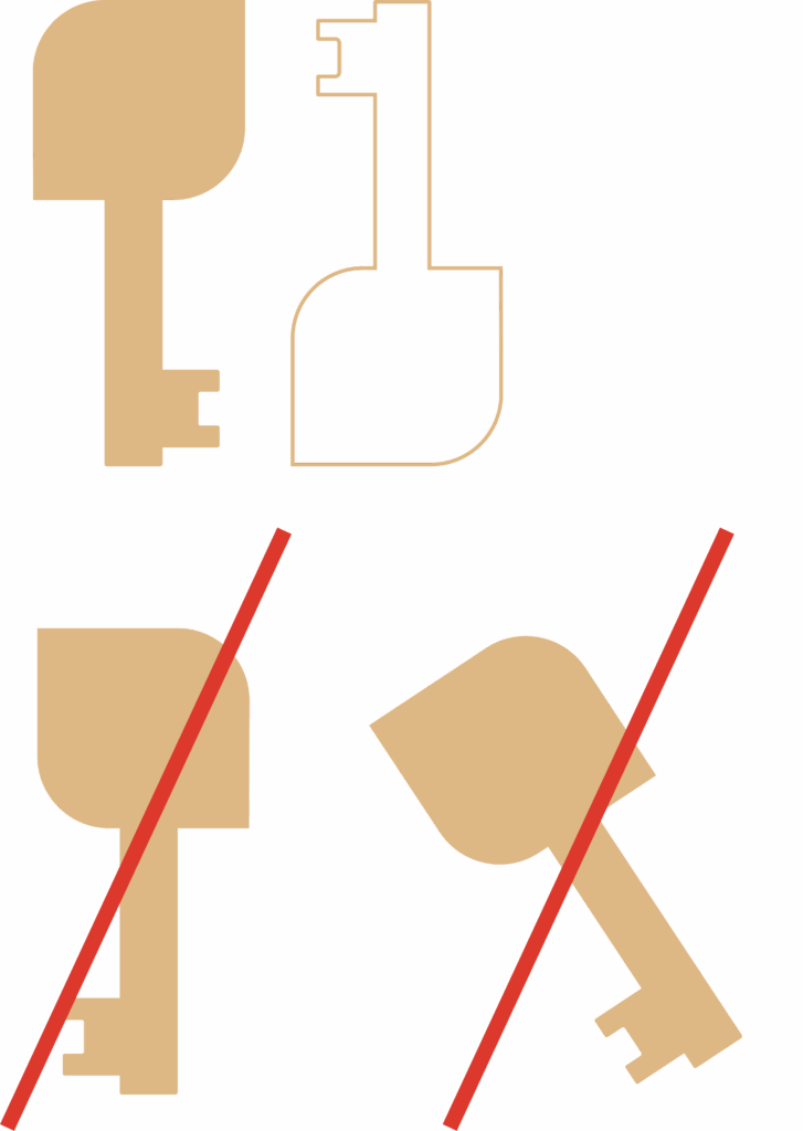 - Zorg dat de rondingen van de sleutel zich altijd linksboven en rechtsonder bevinden bij de kop van de sleutel.